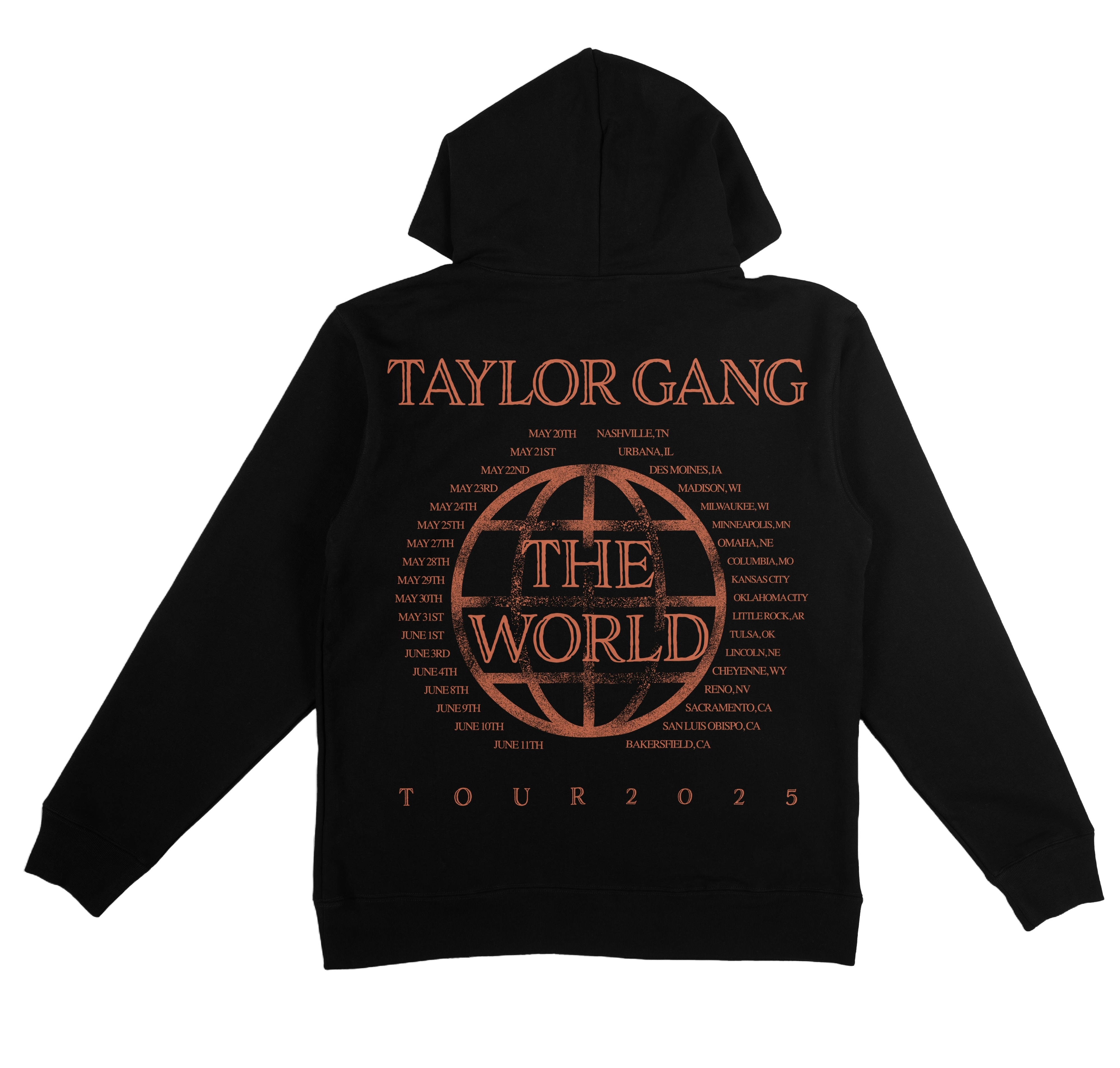 Kush & Orange Juice 2 Hoodie from the Taylor Gang The World Tour. 100% cotton heavyweight and oversized hoodie with no drawstring and kangaroo front pocket.